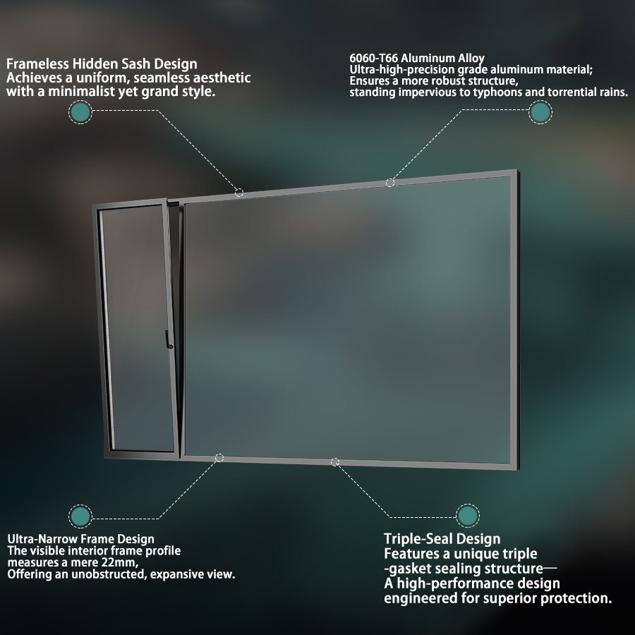 This concealed-sash, narrow-frame, high-performance window system redefines the industry benchmark for high-performance aluminum windows and doors, achieving a perfect balance between refined minimalist aesthetics and industry-leading structural stability and functional utility.